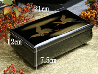 漆器のジュエリーボックス、フタを開けるとオルゴールの音楽に癒されます 手描きの二羽の鶴の蒔絵は日本の伝統的なデザインで、ご結婚のお祝い品にピッタリとご好評をいただいております、海外の方へのお土産にも喜ばれるジュエリーボックスです 11000円(税込) オルゴールの音楽はお選びいただくことができません
